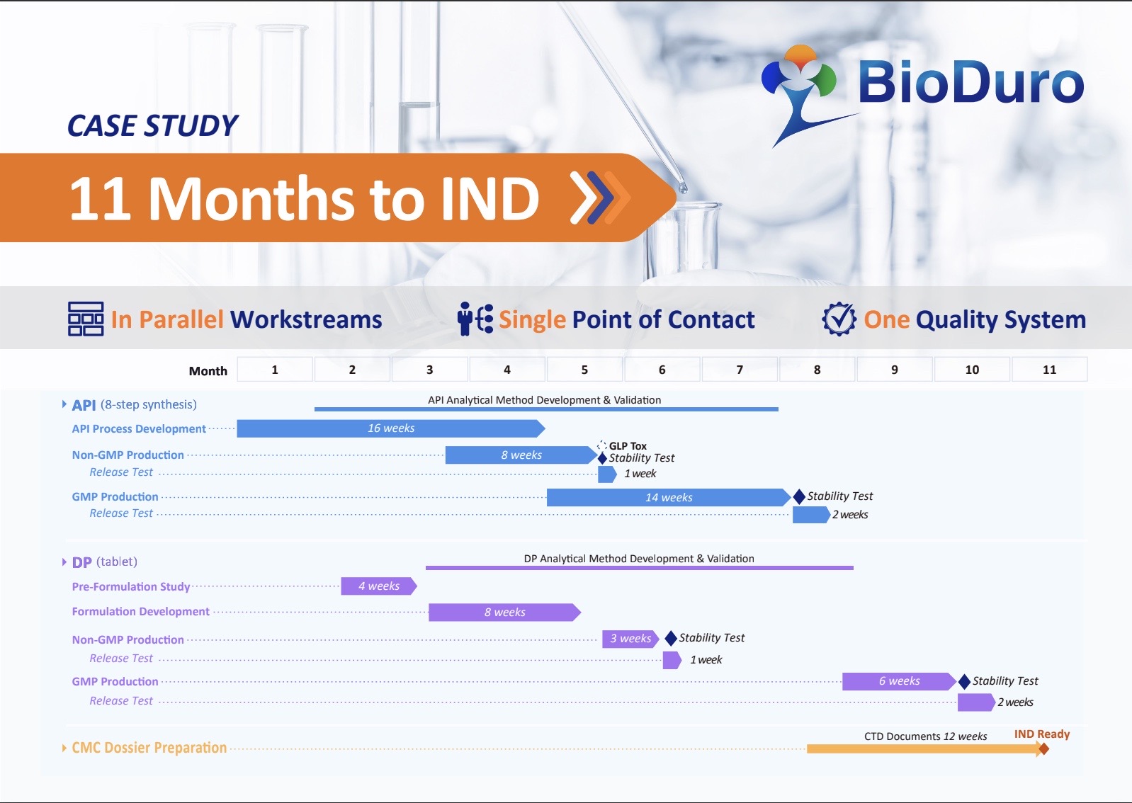 By leveraging these strategic approaches, we achieved IND submission in just 11 months—demonstrating how innovative process optimization can drive faster drug development without compromising quality or regulatory compliance. This case study provides a replicable model for other organizations aiming to accelerate their own development pipelines and bring critical therapies to patients more efficiently. For more information, please visit www.bioduro.com