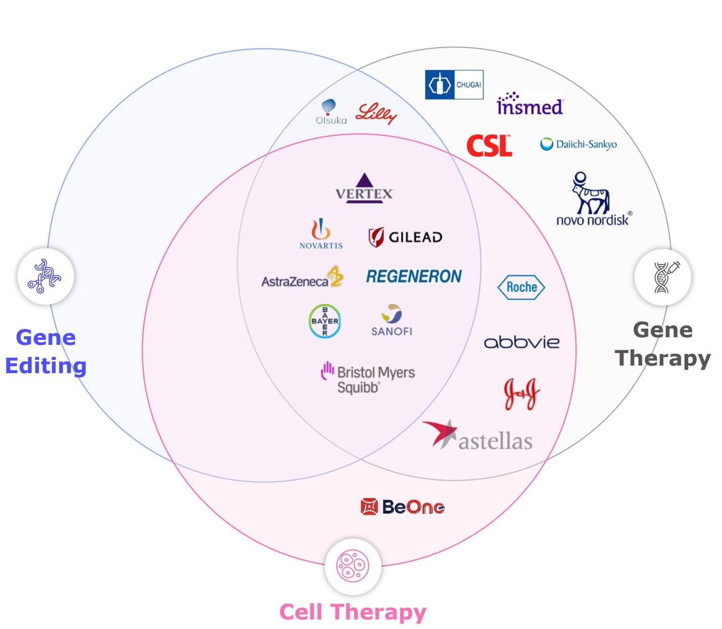 Twenty of the 30 largest biopharma companies by market cap are now actively developing or commercializing cell and gene therapies, with major players like BMS, Bayer, AstraZeneca, Regeneron, Gilead, Novartis, and Vertex working across multiple modalities.