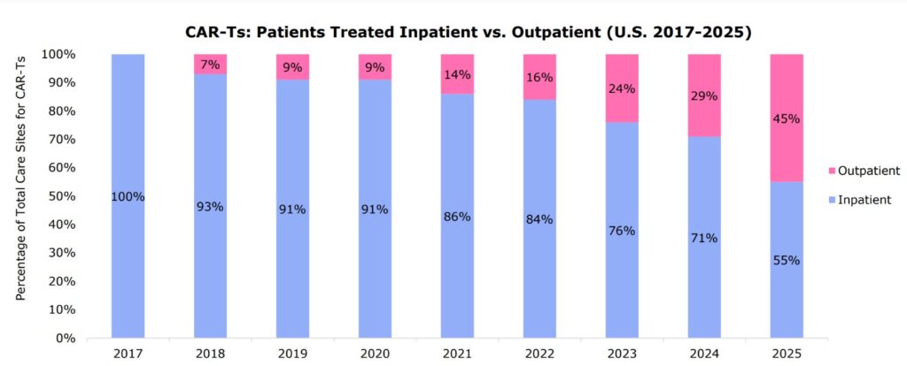 Hunt highlighted the growing outpatient trend for CAR-T therapies. In 2025, 45% of patients received treatment in outpatient settings, up from zero in 2017 and just 29% in 2024. Carvykti has achieved 50% outpatient utilization.