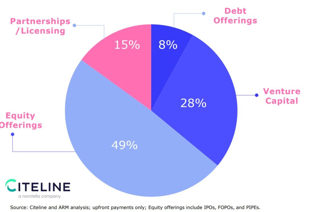 Despite headwinds, the sector’s $11.1 billion in 2025 funding was distributed across venture capital (28%), equity offerings (49%), debt offerings (8%), and partnerships/licensing (15%).
