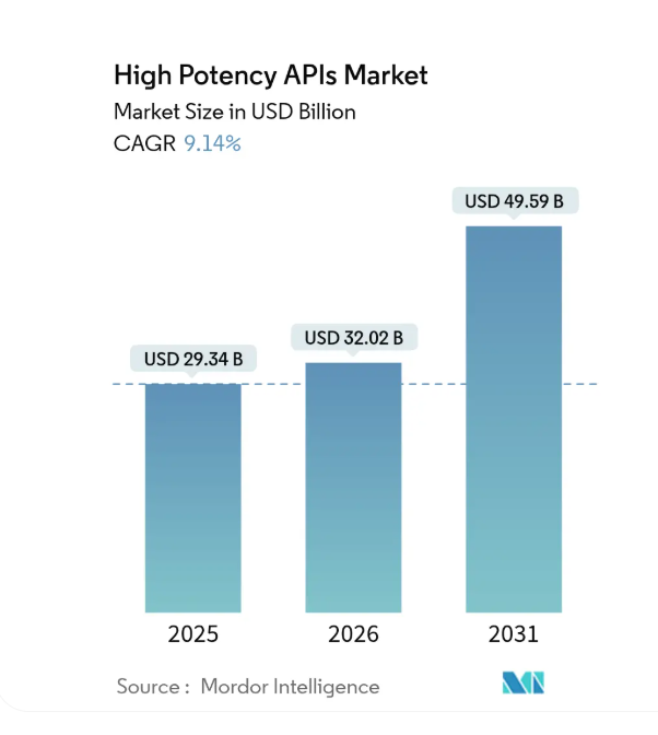 The high potency API (HPAPI) market is projected to grow significantly, reaching USD 32.02 billion in 2026, up from USD 29.34 billion in 2025, and expected to reach USD 49.59 billion by 2031, reflecting a 9.14% CAGR between 2026 and 2031. (Source- Mordor Intelligence)