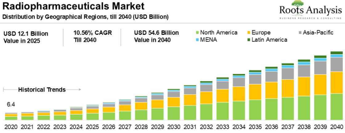 Driven by growing demand for targeted diagnostics and therapeutics, the radiopharmaceuticals market is anticipated to grow significantly—from USD 12.1 billion in 2025 to USD 31.0 billion by 2032, and further to USD 54.6 billion by 2040—registering a strong compound annual growth rate (CAGR) of 10.56% during the forecast horizon. (Source- Roots Analysis)