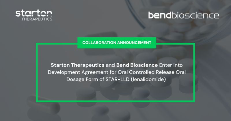 - Starton Therapeutics has entered into a collaboration with Bend Bioscience for the development and manufacturing of STAR-LLD, its sustained release oral formulation of lenalidomide.