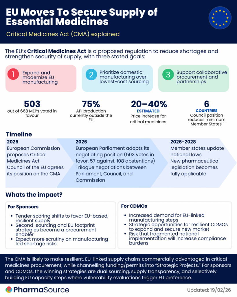 The CMA didn’t emerge from a policy vacuum. COVID-19 exposed just how dependent Europe had become on medicines — primarily older, off-patent molecules used in emergency settings — sourced overwhelmingly from outside the continent. When borders closed, supply chains buckled.